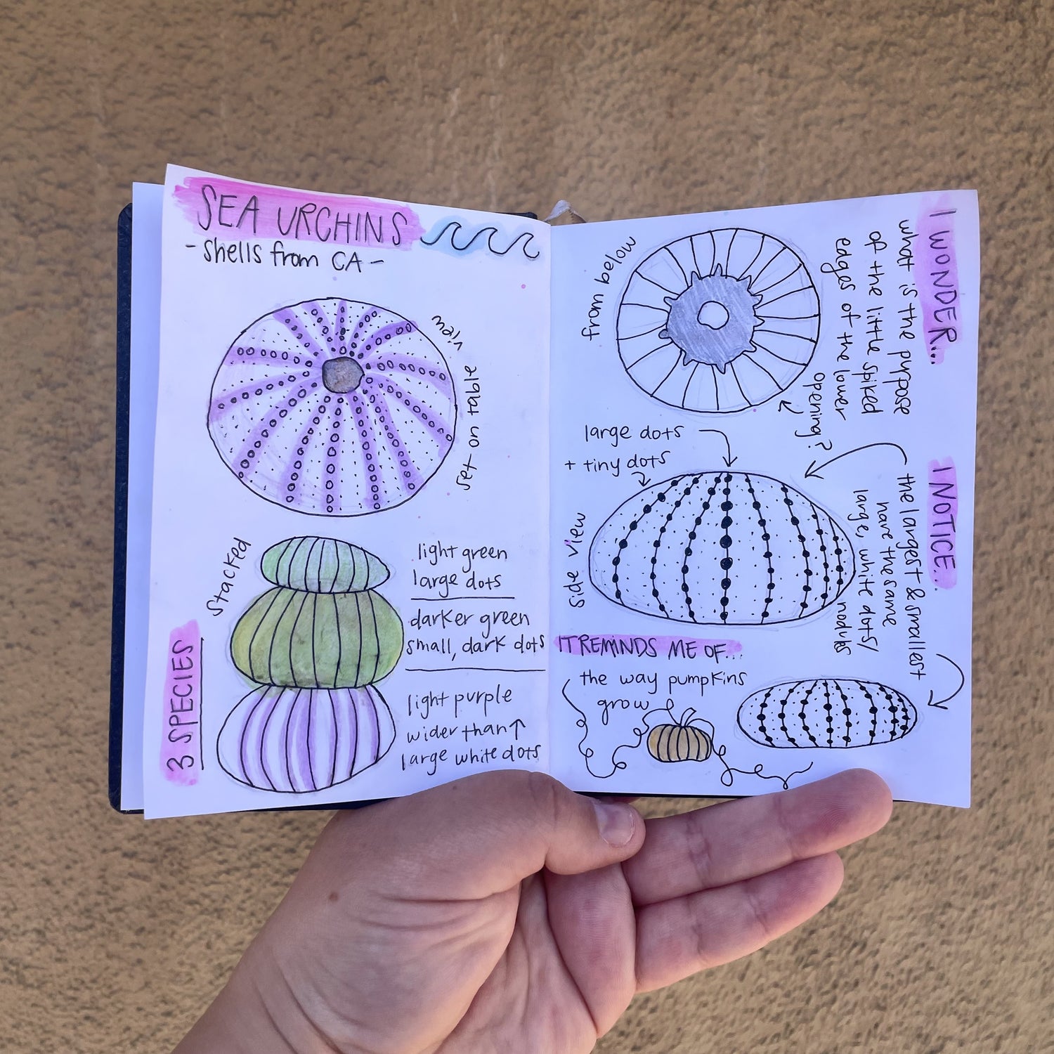 The goal of nature journaling is typically to spend time observing details, patterns, and phenomena in nature around you to activate your curiosity and strengthen your connection to a place. However, there is no right or wrong way to nature journal, and your personal goal can be completely different, or can change day-to-day!